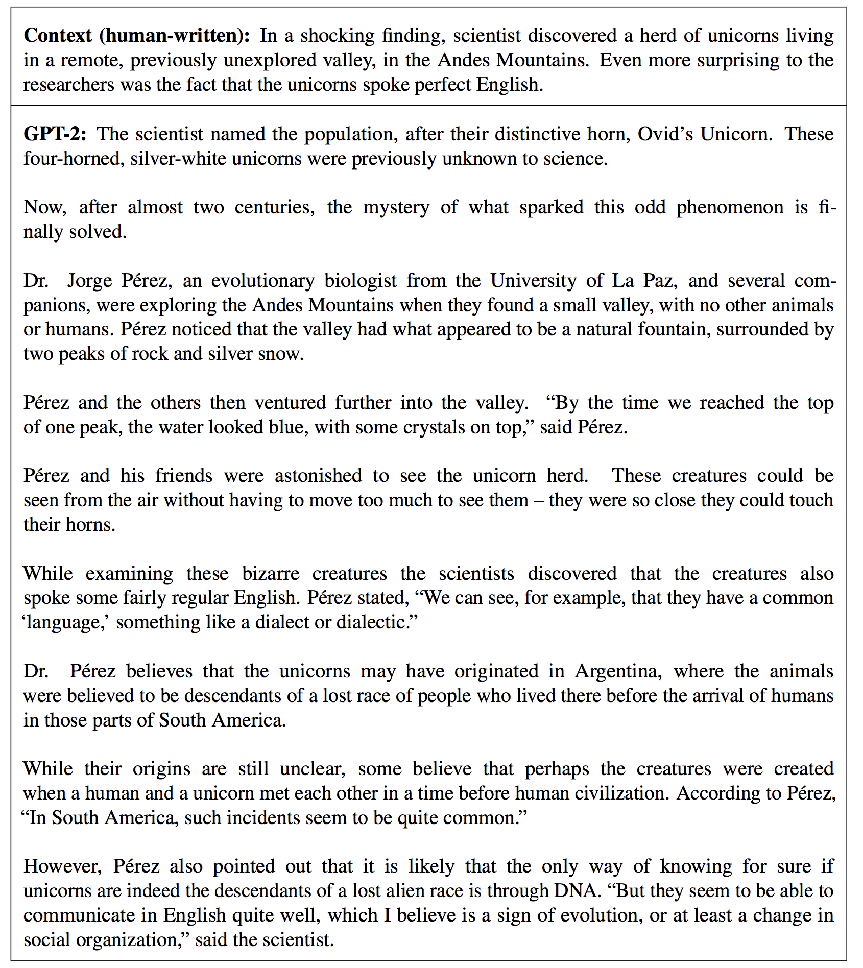 Upon release, GPT-2 generated a lot of hype and attention in large part due to the selected examples which accompanied it, the most famous of which — a news report documenting the discovery of English speaking unicorns in the Andes — can be read here. A unique application of the GPT-2 model has surfaced in form of the AI Dungeon, an online text adventure game which treats user-supplied text as prompts for input into the model, and generated output is used to advance the game and user experience. You can try out AI Dungeon here.